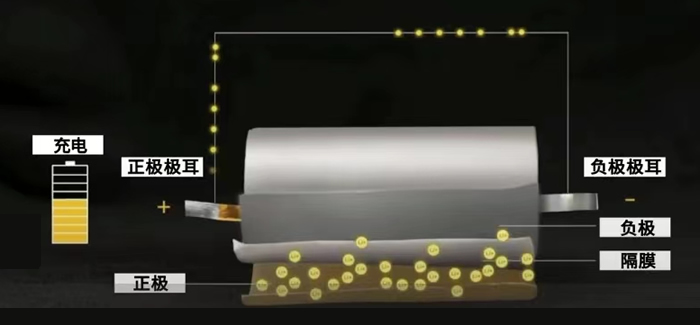我們知道鋰離子電池之所以能夠作為動(dòng)力電池,主要是有電子的定向運(yùn)動(dòng)產(chǎn)生電流,所以鋰離子在里面搖擺,外面里面有個(gè)導(dǎo)體導(dǎo)電,讓電子電荷都跑起來(lái),這才能實(shí)現(xiàn)從放電過(guò)程,這個(gè)就是極耳,也就是進(jìn)出導(dǎo)電引出來(lái)成為接觸點(diǎn),外部的結(jié)構(gòu)就搭上,電子才能跑起來(lái)才有充放電模式。